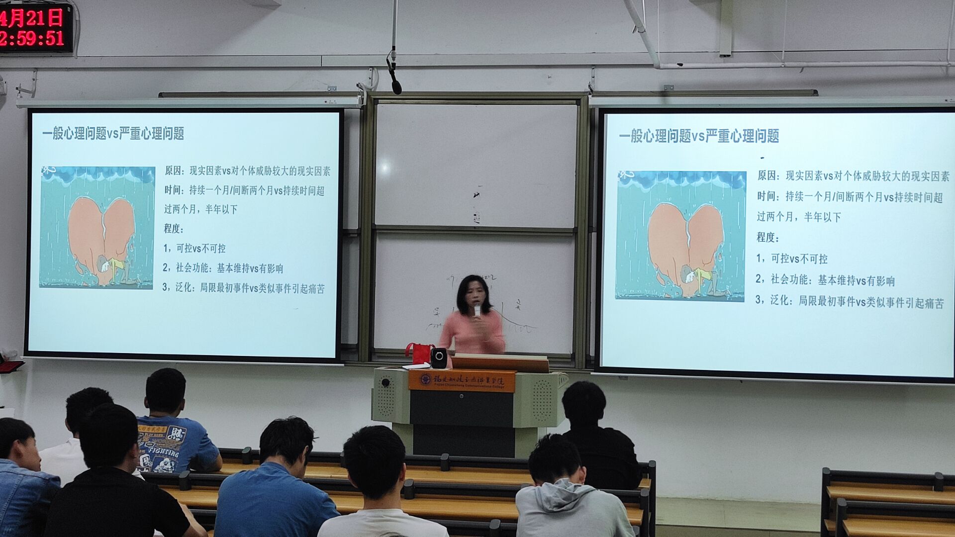 随后,何老师结合工作实际就大学生心理健康标准、如何鉴别心理正常和异常、不同类型心理问题的诊断知识与干预措施等几个方面的内容进行了深入的讲解。同学们表示受益匪浅。本次培训有利于提升心理委员的责任意识,进而认真对待今后的各项工作,为我院夯实班级心理健康教育工作奠定扎实基础。